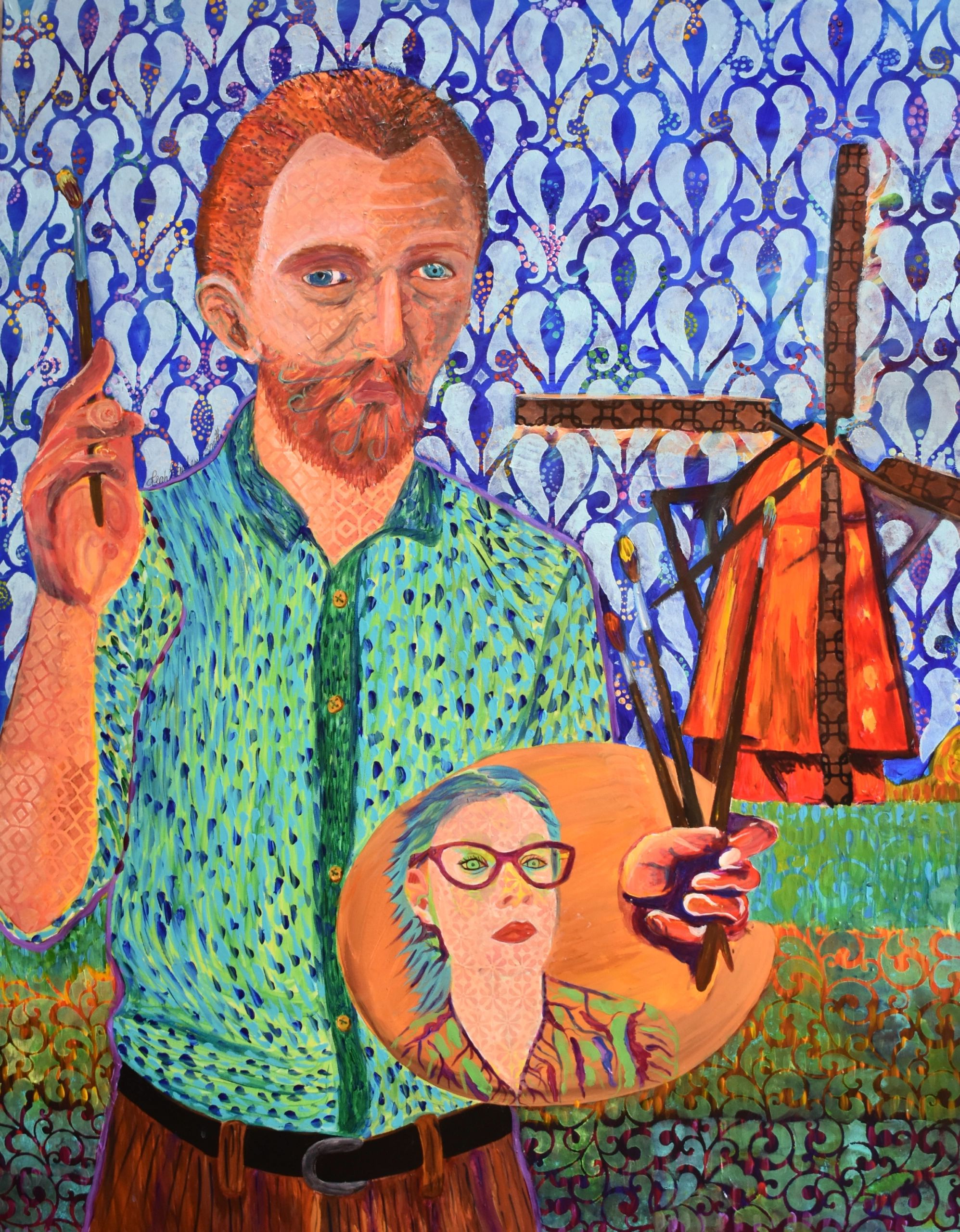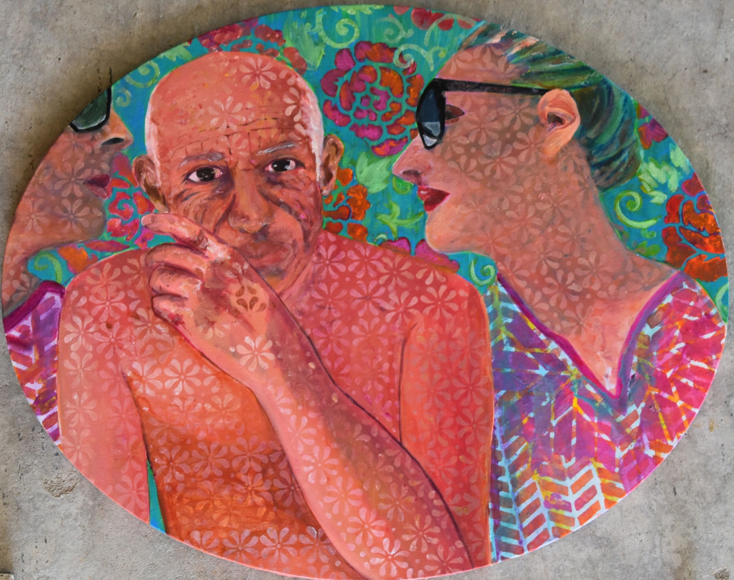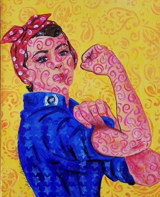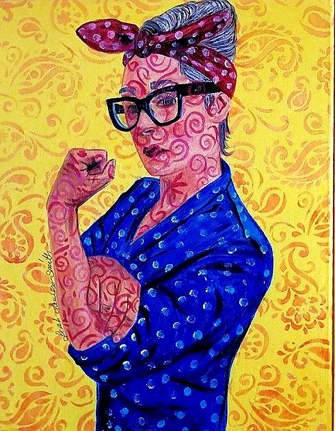 Georgia O'Keefe has blown me away as an admired artist. Her use of close up cropped style of paintings has influenced my own work. She wanted the viewer to see the beauty she saw. I have always remembered that statement. Her use of color and simplicity has a unique quiet beauty that has filled me with joy. I want to pay her homage by painting her portrait and adding a background influenced by her work and my repetitive pattern use. I also tried a split canvas, inspired by one of my fellow artists.