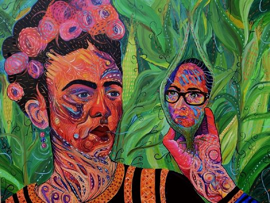 I want to paint one of my art idols, I chose Frida Kahlo to be my first Art Icon painting. Frida is shown with bright intense colors with a corn maze background. Corn is the national crop of Mexico and is important to the foods and culture of Mexico. Frida holds an ear of corn that is partially shucked with my portrait revealed. she has given my imagination life and inspiration. I wanted to pay her tribute.