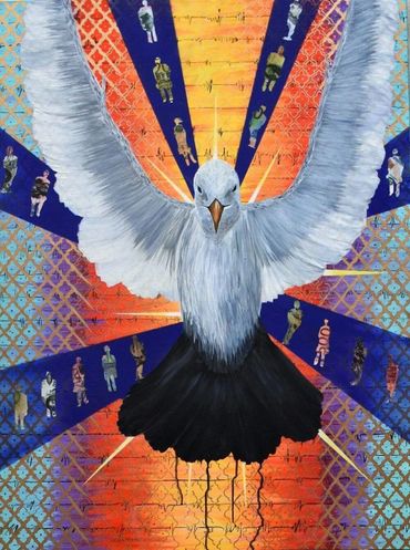Jesus with Sacred Heart (piston is a Vespa piston represented) stands on the globe of the world with focus on the United States map and silhouette of vehicles being the dominant feature. On the outside of the globe is silhouettes of Dallas on the left and Houston on the right side. Behind the head of Jesus is a halo of headlights from vehicle casting light from behind. In the wide rays that direct from his body are symbols of Texas: The painting is loaded with symbols of Texas. The mockingbird is a symbol of innocence and our state, the cactus for unconditional love, the armadillo for protection, cotton for strength, and bluebonnet for memory of the dead and struggle to survive. Rays of gold with black shoot out from Jesus symbolizing black gold oil. Even though Texan defenders suffered defeat, the siege at the Alamo became a symbol of heroic resistance. On April 21, 1836, when Houston and a force of some 900 men routed 1,200-1,300 Mexicans under Santa Anna at the Battle of San Jacinto, the Texan forces shouted, Remember the Alamo. The Alamo is symbol of perseverance.